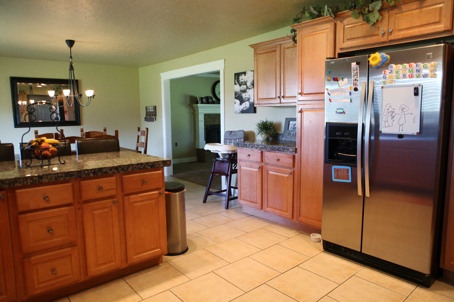 For some odd reason, the paint color in the picture in the kitchen & dining room look green. Rest assured, the paint was two-tone green & purple & I was NOT inspired by it. It's more of a tan. You can get a good idea of how it really looks in the master bedroom picture.